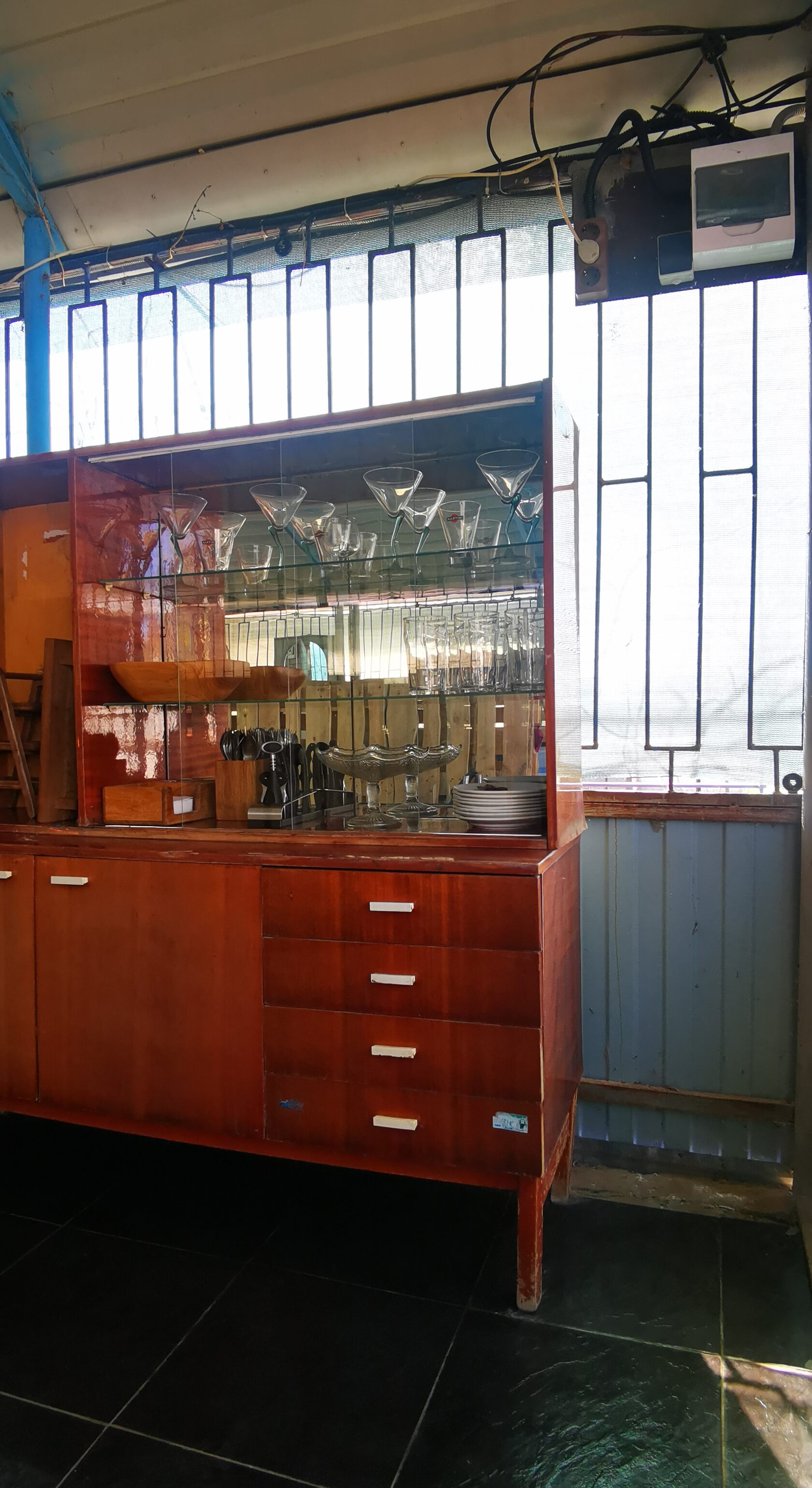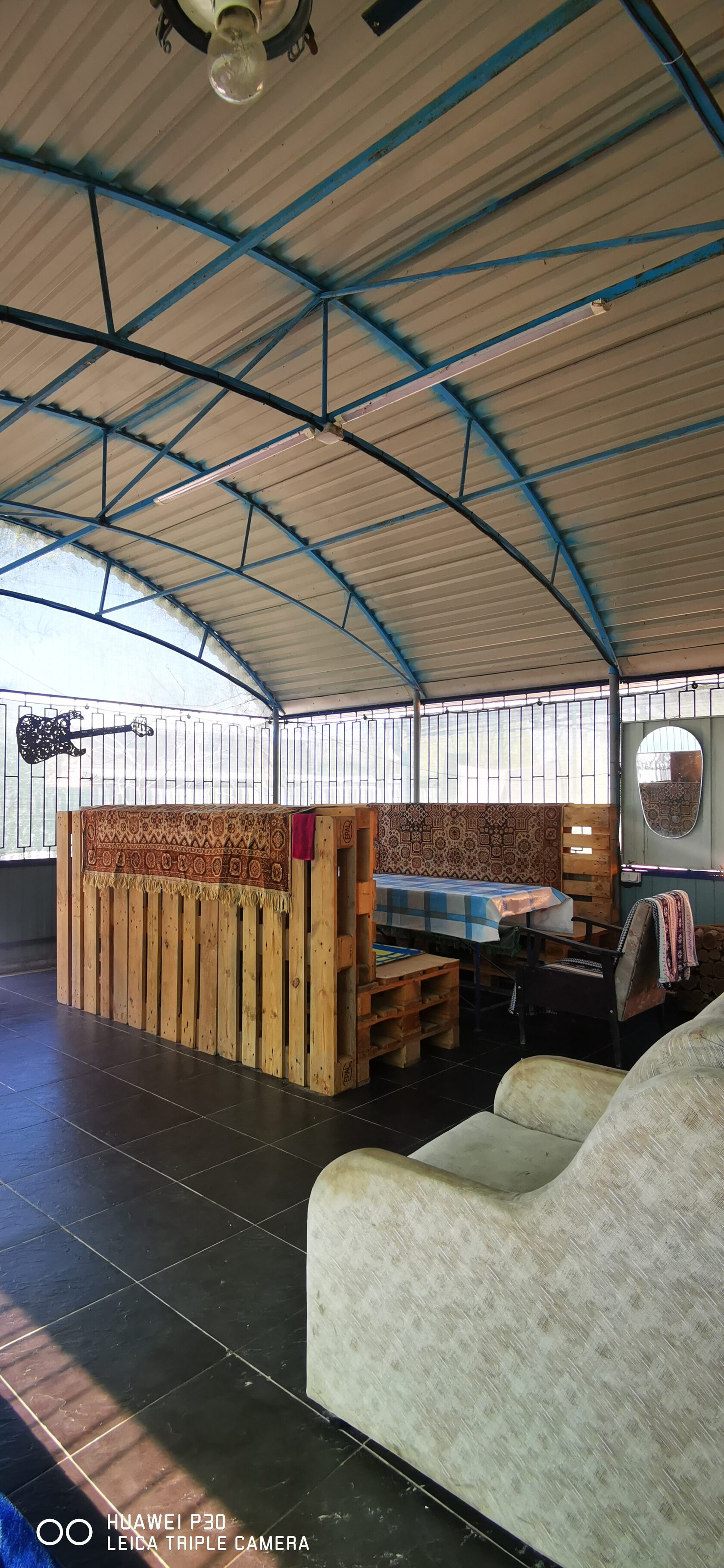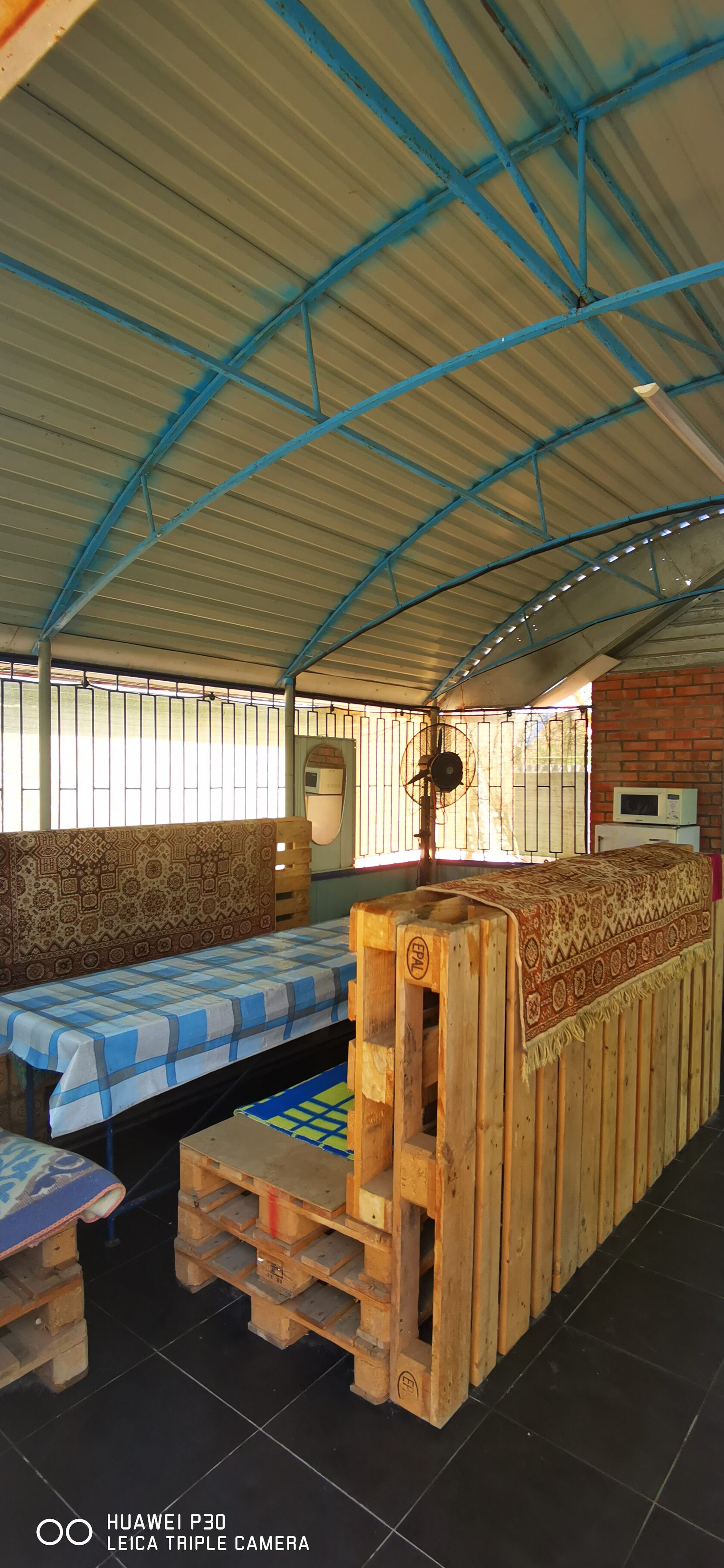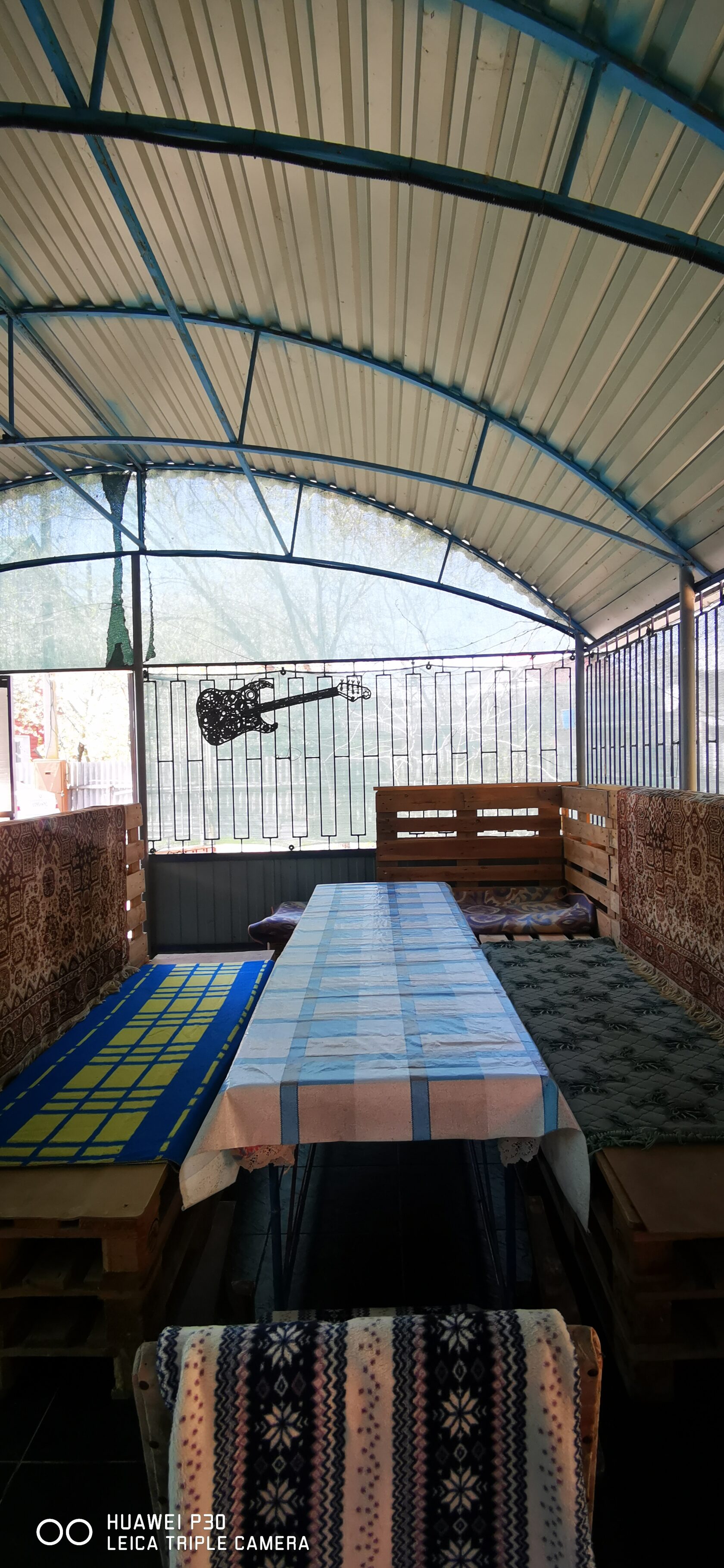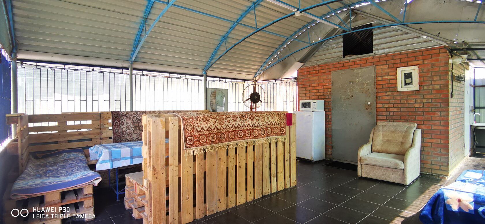Всё предельно просто, диваны сделаны из паллет, дополнительно уложены на них матрасы и пледы. Обеденный стол рассчитан на 10 человек. Рядом со столом есть дополнительный стол для размещения вспомогательных продуктов или предметов сервировки. Рядом со столом есть возможность установить вентилятор с водяным орошением, в жаркую погоду достаточно эффективная вещь.