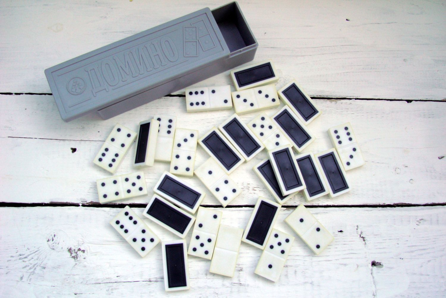Комплект домино. Стандартный набор включает 28 костяшек, на каждой из которых изображено два числа от 0 до 6, обозначенных точками.